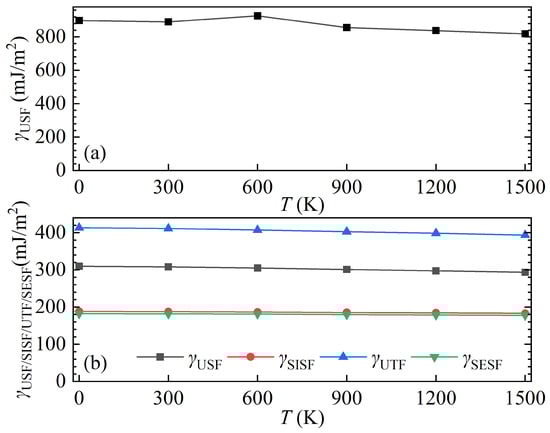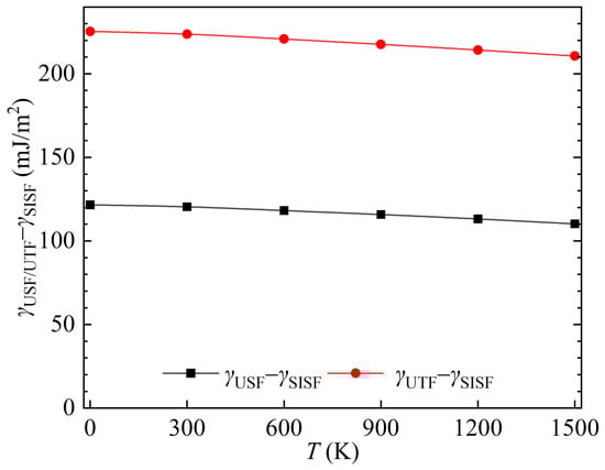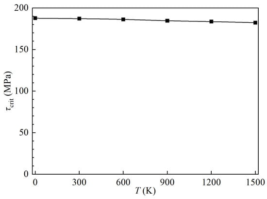 Here, represents the Burgers vector associated with the relevant Shockley partial. The predicted values of for -TiAl at different temperatures are shown in Figure 8. From the figure, one can find that the value for -TiAl decreases from 187.62 to 182.30 MPa with increasing temperature from 0 to 1500 K. This changing trend is also same with those for FCC Cu and Ni [17]. Experimental measurements have shown that the critical resolved shear stress for twinning in Ti44Al56 reduces from 240 to 80 MPa as the temperature rises from 982 to 1350 K [43,44], which qualitatively aligns with our findings. The decrease in critical twinning stress with temperature suggests an increased propensity for twinning in -TiAl at elevated temperatures, which appears to contradict the observations made regarding the twinnability parameters above. This discrepancy may arise from the competitive nature of dislocation-mediated slip and deformation twinning, which is primarily governed by the ratio of twinning to Peierls stresses. It is important to note that both deformation twinning and dislocation slip can be influenced by factors such as composition, strain rate and grain size [44,45]. Because the current twinnability criteria do not fully account for the effects of composition, strain rate, and grain size, the predictions regarding twinnability based on critical twinning stresses can not explain the observed increase in deformation twinning density and the corresponding decrease in dislocation density with rising temperature [44,45].