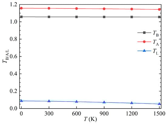 Jo et al. [36] proposed a comprehensive theory for the plastic deformation of FCC metals, demonstrating that the ratio () of to () for the trailing 1/6<112> dislocation serves as a primary parameter for characterizing the deformation behavior of FCC metals. The critical values of delineate four distinct classes of material deformation: stacking fault only (), stacking fault with full slip (), full slip with twinning (), and full slip only (). The predictions on the ratio of -TiAl at different temperatures are shown in Figure 5. It can be seen from the figure that the value of increases with rising temperature, but it remains within the range of 0 to 2 across temperatures from 0 to 1500 K. This indicates that ordinary dislocation slip and order twinning are both viable deformation modes in -TiAl over the entire temperature range. Based on absolute zero temperature and shown in Table 1, the is calculated as 1.011 [6], 1.343 [7], 1.341 [8], 1.008 [9], 1.279 [10], and 1.151 [16], respectively. Although the present result of 1.547 for the is relatively larger than these theoretical values, the values from the current and previous calculations are all located between 0 and 2. From the perspective of deformation mode prediction, therefore, our findings are qualitatively consistent with those of previous studies [6,7,8,9,10,16]. Furthermore, the deformation by order twinning and ordinary dislocations can exist in -TiAl-based alloys over a wide range of temperatures [5], which aligns well with our present results.