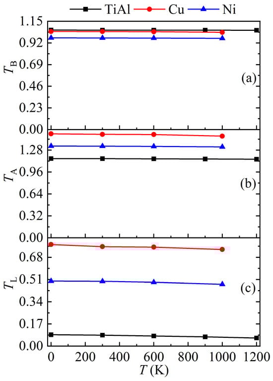 Inherent twinning is predicted when . The predictions on the three parameters of -TiAl at different temperatures are shown in Figure 6. It can be seen from the figure that the values of ,, and decrease with rising temperature, indicating the diminishing twinning propensity of -TiAl with temperature rise. Meanwhile, over the temperature range of 0 to 1500 K, both and remain greater than unity, while falls within the range of zero to unity. These suggest that deformation twinning is favored relative to dislocation slip across temperatures of 0 to 1500 K. Temperature dependences of the twinnability parameters for -TiAl are compared with those for FCC Cu and Ni [17], as shown in Figure 7. It can be found from the figure that the change trends in twinnability for -TiAl are same with those for pure Cu and Ni. Meanwhile, at identical temperatures, the TB value for -TiAl is comparable to that of Cu and slightly larger than that of Ni. Its value is relatively smaller than those of Cu and Ni. However, the value for -TiAl is somewhat greater than zero and much less than those of Cu and Ni. As is known, the numbers of twinning systems in -TiAl are only one-third of those in FCC metals owing to its tetragonality. Thus, it is easy to understand that -TiAl exhibits much weaker inherent twinnability than FCC Cu and Ni. These findings suggest that the onset of twinning in -TiAl is more likely to originate from crack tips or grain boundaries. Experimental observations have identified both grain and lamellar boundaries as prominent sources of Shockley partials [8], which is consistent with our results.