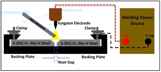 Experiments were conducted using the GTAW process to join 0.3% C-Cr-Mo-V steel (SAE/AISI 4340 (ArcelorMittal, Luxembourg) as per international standards) plates with dimensions 8 mm × 200 mm × 150 mm, having a 60 °V groove angle joint configuration (ASTM Standards) [,,]. A 2.4 mm diameter filler rod made of 0.3% C-Cr-Mo-V steel was used to fill the groove gap in multiple passes. The chemical composition of the base and filler material is listed in Table 1.