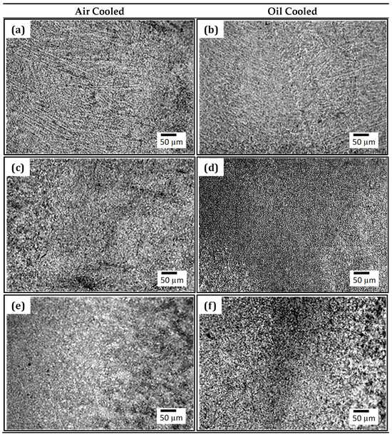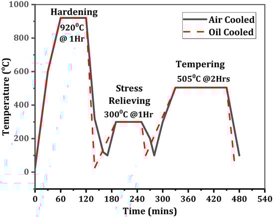 Post experimentation, all defect-free welded samples were subjected to different PWHT procedures, as shown in Figure 2 and Table 3, which involve hardening, tempering, stress relieving, and quenching processes. The processes of hardening and tempering are conducted in an electrical heating furnace with a controlled heating rate of 100 °C per hour. The welded samples underwent PWHT to optimize their mechanical properties. The heat treatment process began with loading at 600 °C to ensure uniform temperature distribution before hardening at 920 °C for 1 h, allowing for complete austenitization and carbide dissolution [,]. The samples were then quenched in either oil or air, with a quenching delay of approximately 45 s, which is short enough to ensure minimal temperature drop and maintain the desired martensitic microstructure. Following quenching, stress relieving was carried out at 300 °C for 1 h to alleviate residual stresses without compromising the hardness [,]. The next step involved tempering at 505 °C for 2 h, promoting a balanced improvement in strength and toughness. Finally, the samples were quenched in oil and air cooled after tempering to preserve the refined microstructure and ensure optimal mechanical properties of the welded joints by enhancing toughness, improving hardness, and ensuring the integrity of the welds, making them suitable for high-strength structural applications.