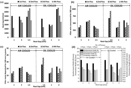 Figure 3 illustrates the impact of process variables, including root gaps and the number of passes, on heat input, filler metal consumption, deposition, and weld bead geometry. The filler metal consumption, deposition, and weld bead geometry depend on the effective heat utilization and distribution. The heat input can be calculated by multiplying the efficiency of the GTAW process by the current and voltage, then dividing by the travel speed. The heat input is determined for every pass and equivalent root gap, as shown in Figure 3a. It is noted that the combined effect of welding parameters, root gaps, and number of passes has a significant influence on heat input utilization and distribution. Regardless of the welding conditions for the first pass of AC samples, the heat input generated is almost the same (approx. ≈ 5000 J/min). This is due to the initial arc of the first pass interacting with the fresh material, where more heat is required to melt the fresh material. The same phenomenon is applicable to the first pass of OC samples and indicates that as the root gap increases, heat input also increases (see Figure 3a). However, the welding speed plays a crucial role in the arc interaction time; therefore, preheating or partial melting of the material takes place. Therefore, heat generated is concentrated more on the base metal and remaining filler material, leading to less consumption (see Figure 3b) and less deposition (see Figure 3c). Additionally, the filler metal droplet also contributes to the heat supplied to the base metal for full melting, and the joint forms. Further, this is apparent in the shallow weld bead geometry wherein the weld width has increased, and penetration has decreased, as shown in Figure 3d.