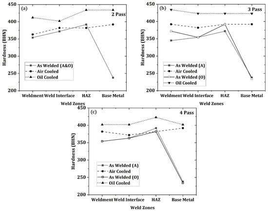 Hardness profile for different welding conditions and heat treatments; (a) 2 pass, (b) 3 pass, and (c) 4 pass.