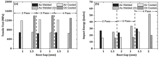 Figure 6 presents the tensile and impact properties of weldments subjected to various PWHTCS. All tensile specimens failed outside the weldment zone, predominantly in the heat-affected zone (HAZ) or at the HAZ–base metal interface. The highest tensile strength is observed in the as-welded condition (before PWHTCS) for both AC and OC weldments, ranging between 650 ± 10 MPa and 690 ± 10 MPa, with an elongation to failure of 11 ± 2% to 18 ± 2%. Table 4 summarizes the recorded ultimate tensile strength (UTS), 0.2% proof strength (PS), elongation (%), and impact toughness under different PWHTCS. The weld joint efficiency, calculated as the ratio of as-welded joint tensile strength to that of the as-received plate, exceeds 90%, consistent with literature findings [,]. As discussed in Section 3.3.1, the variation in cooling rates across different weld zones results in microstructural heterogeneity, influencing the tensile failure location [,,]. In case of fracture toughness, the PWHTCS and number of passes has significantly improved the fracture toughness. Figure 6a illustrates that an increase in the number of passes leads to a reduction in tensile strength, indicating enhanced ductility. The inverse relationship between hardness and toughness is evident in Figure 6a,b. As a result, impact toughness improves with increasing passes, with energy absorption capacity rising from 25 ± 2 J to 50 ± 2 J. This variation in impact toughness, despite increased hardness during heat treatment, such as oil quenching or air cooling, occurs because martensite, which forms during quenching, is very hard yet brittle (see Figure 5). While tempering can improve toughness by reducing brittleness, excessive quenching or improper tempering may result in retained austenite or overhardened martensite, which reduces toughness [,]. Oil cooling, however, achieves a balance between high hardness and maintaining toughness, as it produces a finer martensitic microstructure compared to air cooling, while also preventing excessive brittleness. Additionally, the number of passes significantly refined microstructure prior to heat treatment, thereby enhancing toughness without sacrificing strength, as shown in Figure 6b. This makes oil quenching, followed by tempering and combined with optimized welding procedures, an effective method for achieving both improved hardness and enhanced toughness in welded components.