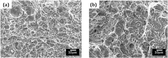 Fractographic analysis of impact-tested specimens (Figure 7) reveals that as-welded samples exhibit a mixed fracture mode, characterized by brittle cleavage facets (martensitic regions) and ductile dimples at ferrite–bainite interfaces (Figure 7a).