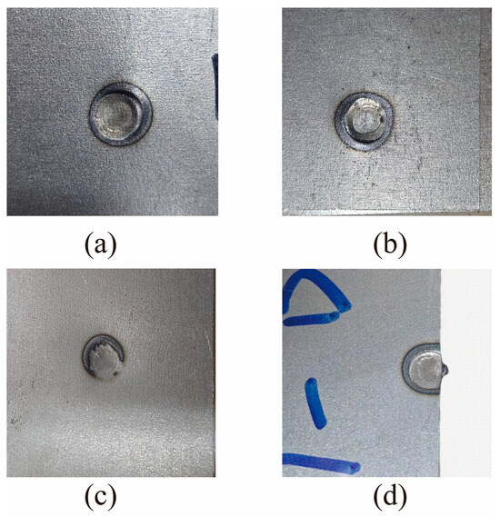 - False welding experiment: Under the conditions of the selected electrode contact surface diameter of 6 mm, welding current of 5 kA, and welding duration of 280 ms, we tested the pressure of 4 kN in the preliminary experiment and found that it was more likely to cause false welding defects. To further investigate the impact of pressure on weld quality, we designed two pressure conditions of 3 kN and 4 kN for comparative analysis;