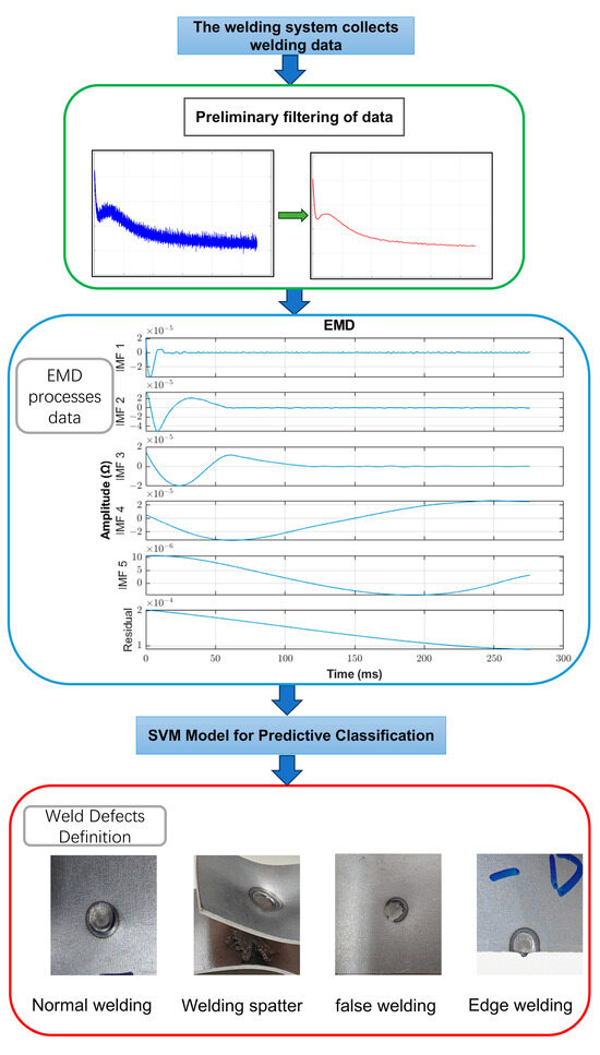 - This study investigated main defects in the RSW process (welding spatter, false welding, and edge welding) and extracted 12 features of normal and defective joints using a Butterworth filter. A new EMD-SVM classification method is proposed to improve the accuracy of distinguishing normal from spatter welding points. Through an online quality evaluation of 144 welding points, the method achieved 97.73% classification accuracy, outperforming other models. An online quality evaluation and defect classification model was developed, enabling rapid and accurate classification of welding points.