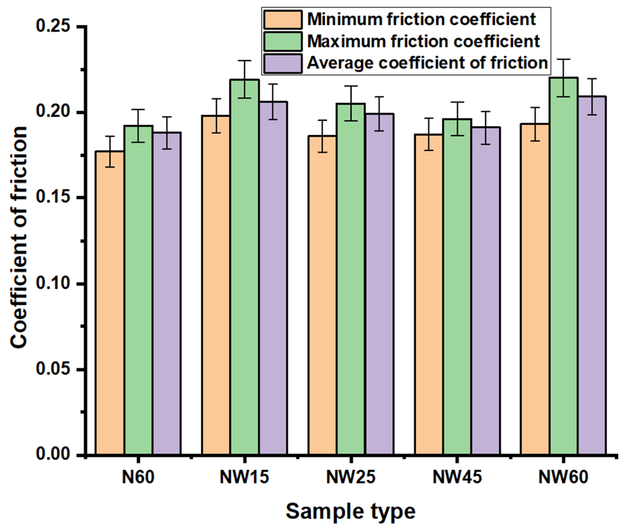 The wear mechanism of the N60 biomimetic unit was abrasive wear and oxidative wear. Adding WC to the nickel-based alloy powder changed the wear mechanism of the biomimetic units, namely, to adhesive wear, abrasive wear, and oxidative wear. As the WC content increased, the friction coefficient of the biomimetic unit initially showed a downward trend, followed by an upward trend. As the WC content increased, the hardness of the biomimetic unit increased, leading to a gradual reduction in wear. WC, as a hard phase, enhanced the strength and wear performance of biomimetic units.