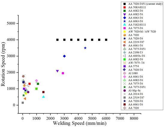 Welding parameter (feed rate and rotational speed) distribution of previous research findings and current investigation.