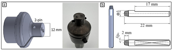 FSW was adopted in butt joint configuration and in the rolling direction on position control mode via a five-axis FSW machine (PTG Heavy Industries, Elland, UK) capable of producing 60 kN load force along the vertical axis, maximum torque of 160 Nm, 6000 mm/min feed rate, and 4000 rpm rotational speed. The welding tool was made from H13 tool steel and was heat-treated to the final 52 HRC hardness with 12 mm shoulder diameter and 3 mm diameter tapered threaded multi-pin (2-pin) geometry. The pin length and pin depth were 1.48 mm and 1.64 mm, respectively. The parameters were selected based on prior empirical knowledge and experience with the multi-pin tool. The tool shape and CAD model of the employed tool are given in Figure 2.