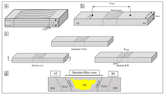 Additionally, μ-CT (Xradia Versa 520, Carl Zeiss AG, Oberkochen, Germany) was adopted in isometric view, and two perpendicular sections for a 3D characterization were analyzed with regard to possible internal defects (Figure 3c). Moreover, different zones generated during the HSFSW process are illustrated in Figure 3d, including the BM, HAZ, TMAZ, and NZ. Finally, scanning electron microscopy (SEM) (Zeiss REM Ultra Plus, Carl Zeiss AG) equipped with electron backscatter diffraction (EBSD) (Symmetry, Oxford Instruments plc, Abingdon, UK) at an accelerating voltage of 20 kV using a CCD-based EBSD detector (Bruker e-flash) was employed for grain size characterization. Following the microstructure analysis, ATEX software version 4.14 was used to calculated the grain size [51]. Prior to the EBSD examination, the surface of selected samples was prepared for 2 h using vibropolishing in a colloidal silica solution.