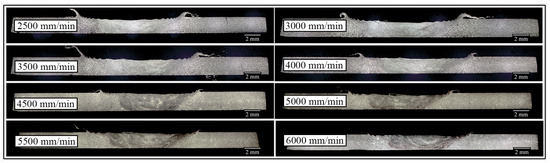 - Even at the maximum feed rate of 6000 mm/min, the minimum hardness remained within an acceptable range, confirming that defect-free and mechanically reliable joints can be achieved under high-speed conditions.