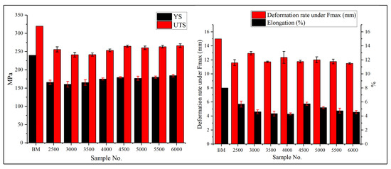 The ultimate tensile strength (UTS), yield strength (YS), deformation rate, and %elongation of the welded samples. The numbers in the X-axis represent the feed rate in mm/min unit.