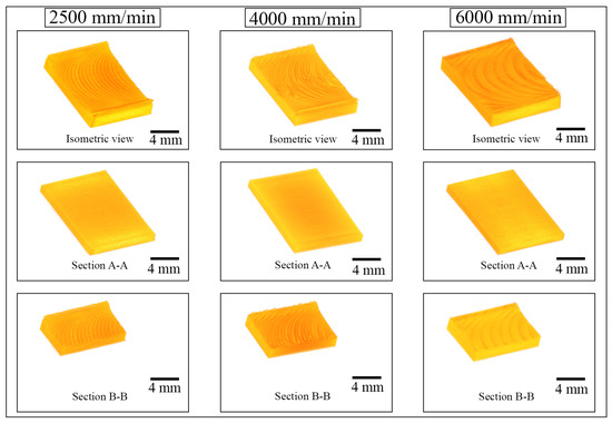 The analysis revealed no internal defects or discontinuities in any of the examined sections, regardless of feed rate. This consistent absence of flaws strongly confirms the structural soundness of the welds and underscores the effectiveness of the multi-pin tool in promoting uniform plastic deformation and material consolidation throughout the weld zone. The results validate that even at the highest applied feed rate of 6000 mm/min, sufficient heat generation and material flow were achieved to prevent the formation of voids or micro-cracks, thus ensuring weld quality. These findings highlight the suitability of the multi-pin HSFSW technique for high-speed industrial applications where both productivity and joint reliability are critical.