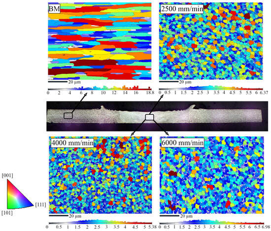 The grain size of the welded zone in the BM and nugget zone was measured through fine EBSD scans to illustrate further the reliability and homogeneity of using the multi-pin tool in HSFSW. It is observed in Figure 8 that there are distinct differences in the size and shape of the grains in BM and NZ. The grains of the BM are elongated in shape in the rolling direction, and their average size is found to be 11.31 µm (Figure 8, BM). However, this microstructure of BM is substantially affected by the extensive plastic deformation during FSW. Fine equiaxed grains are found in NZ, having average grain sizes of 3.09, 2.47, and 3.01 µm at the feed rates of 2500 mm/min, 4000 mm/min, and 6000 mm/min, respectively (Figure 8, 2500, 4000, 6000 mm/min). Thus, a more than 70% reduction in grain size has occurred, which can be explained by dynamic recrystallization [16,21,41]. The finer grain size is found to be correlated with high feed rate [21,30]. At high-speed FSW, NZ experiences lower heat input per unit length at a constant rotation rate, and a short time is available for grain growth after recrystallization. As a result, smaller-sized grains are found in NZ [21,45]. During conventional FSW, in which a single pin is used, the pin causes stirring action inside the material during the welding process. Nonetheless, as two pins are used in this investigation, more material is stirred, and subsequent plastic deformation in the NZ occurs. The grain sizes in the NZ at three different feed rates are very close to each other. These uniform and fine microstructural characteristics assure the reliability and repeatability of HSFSW. Furthermore, the results proved that HSFSW using the multi-pin tool is highly suitable for industrial applications where consistent mechanical properties are critical, offering increased productivity without sacrificing microstructural integrity.
