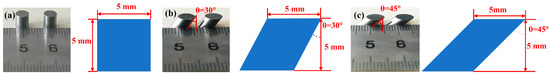 To obtain the dynamic mechanical properties of the WMoZrNiFe energetic structural material under medium-to-high-strain-rate conditions (10~104 s−1), dynamic compression experiments were conducted using the split-Hopkinson pressure bar (SHPB) apparatus. The dynamic compression samples were cylindrical with a diameter of 5 mm and a length of 5 mm, as shown in Figure 2. In dynamic compression experiments, due to different inclination angles, the specimen is under different compression-shear stress conditions. On the condition of three representative inclination angles (0°, 30°, and 45°), the dynamic mechanical response and the ignition threshold of WMoZrNiFe energetic structural material could be obtained.