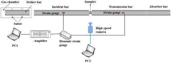 The SHPB apparatus consisted of a high-pressure gas chamber, strike bar, incident bar, transmission bar, and energy absorption device. The dimensions of the striker bar were Φ14 mm × 200 mm, the incident bar was Φ14 mm × 1200 mm, and the transmission bar was Φ14 mm × 1200 mm, with all bars being made from high-strength steel (elastic modulus: 190 GPa, density: 7800 kg/m3, wave velocity: 4900 m/s). The strike bar velocity was adjusted through pressure modulation in the gas reservoir, enabling controlled energy input into the test specimen.
