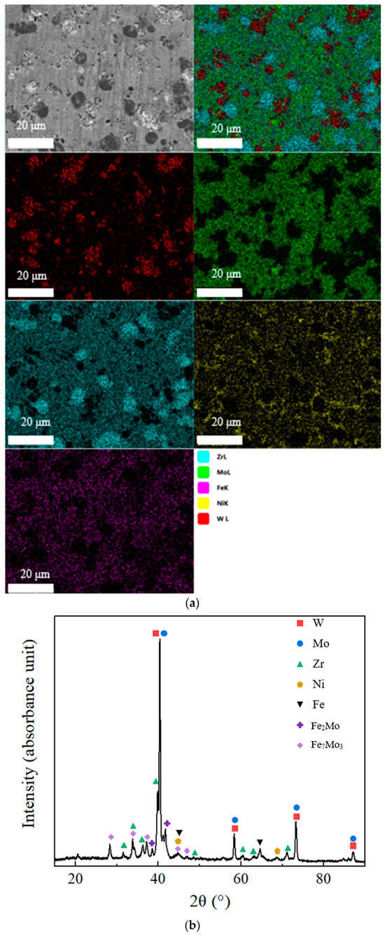 Figure 3a shows the SEM image of the WMoZrNiFe energetic structural material, along with the EDS elemental mapping results. Figure 3b presents the XRD phase distribution of the WMoZrNiFe energetic structural material after sintering. As shown in Figure 3a, the EDS elemental distribution results indicate the occurrence of element segregation. Specifically, W, Mo, and Zr are enriched, while Fe and Ni are more evenly dispersed. In Figure 3b, the XRD phase distribution reveals that after sintering the WMoZrNiFe, an alloy structure is formed.