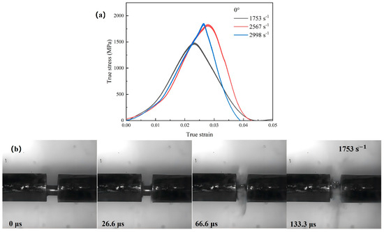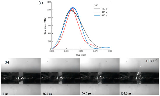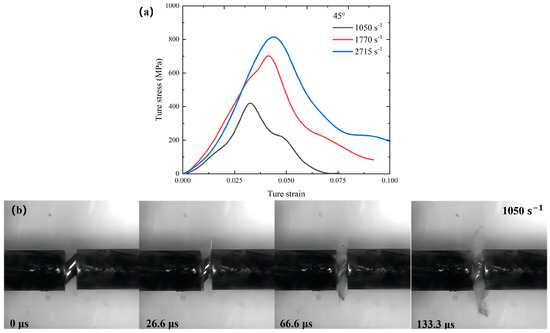 Figure 4, Figure 5 and Figure 6 present the true stress–true strain curves and deformation failure processes for the WMoZrNiFe energetic structural materials at 0°, 30°, and 45°. Figure 4b, Figure 5b and Figure 6b demonstrate that the WMoZrNiFe energetic structural materials exhibit high compressive strength and strain rate effects. For the 0° sample, as the strain rate increased from 1753 s−1 to 2998 s−1, the compressive strength increased from 1468 MPa to 1837 MPa. For the 30° sample, when the strain rate increased from 1137 s−1 to 2817 s−1, the compressive strength increased from 982 MPa to 1053 MPa. For the 45° sample, as the strain rate increased from 1050 s−1 to 2715 s−1, the compressive strength increased from 420 MPa to 812 MPa. Obviously, as the inclination angle increased, it was much easier for the specimen to fracture. The dynamic response of the shear-dominated deformation mechanism governed the plastic flow. Further, it enhanced accumulation of plastic deformation and consequently led to an elevated failure strain.