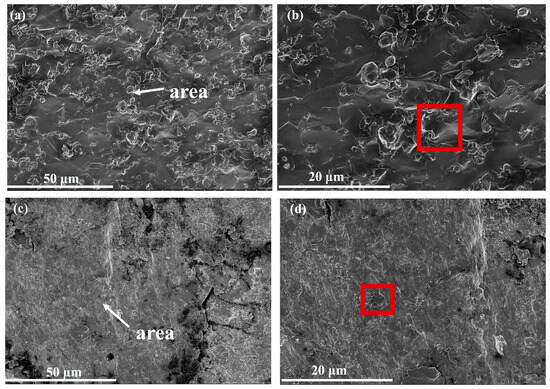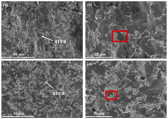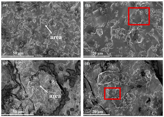 To further analyze the failure mechanism of the WMoZrNiFe energetic structural material under dynamic compression, the fracture morphology was observed using SEM. Figure 7, Figure 8 and Figure 9 show the fracture morphologies of the 0°, 30°, and 45° WMoZrNiFe energetic structural materials under dynamic compression at different strain rates (with the area representing the region observed under higher magnification).