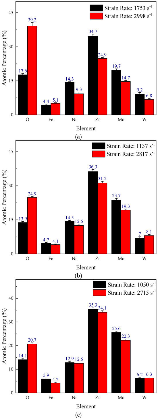 For the 0° WMoZrNiFe sample, when the strain rate increases from 1753 s−1 to 2998 s−1, the atomic percentage of O increases from 17.65% to 39.17%. For the 30° WMoZrNiFe sample, when the strain rate increases from 1137 s−1 to 2817 s−1, the atomic percentage of O increases from 13.85% to 24.90%. For the 45° WMoZrNiFe sample, when the strain rate increases from 1050 s−1 to 2715 s−1, the atomic percentage of O increases from 14.11% to 20.73%. This indicates that as the strain rate increases, the reaction between the active elements in the energetic structural material and oxygen from the air becomes more intense, increasing the oxygen content in the reaction products.