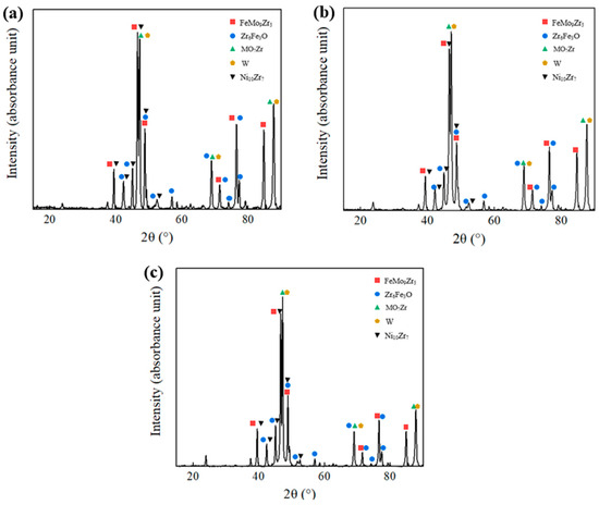 XRD analysis results of recovered residues from the WMoZrNiFe energetic structural material following dynamic compression experiments. (a) 0° WMoZrNiFe ESMs (b) 30° WMoZrNiFe ESMs (c) 45° WMoZrNiFe ESMs.