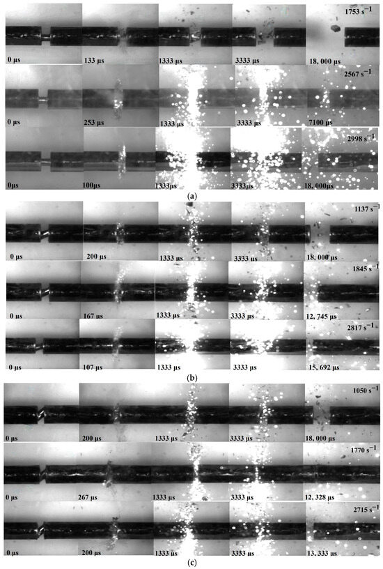Figure 4b, Figure 5b and Figure 6b illustrate the deformation and failure evolution of the WMoZrNiFe energetic structural materials under dynamic compression. All three samples exhibited the same fracture type, characterized by axial splitting. A comparison of the fracture strength for the three different inclination angles at similar strain rates revealed that the sample’s inclination angle significantly influenced its fracture strength. Within the 0° to 45° range, the greater the inclination angle, the lower the corresponding fracture strength.