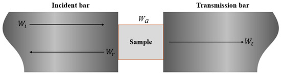 According to [19], energy dissipation during the SHPB, loading process mainly involves the energy required for fracture and the kinetic energy of the broken particles. Among them, the kinetic energy accounts for a small proportion of the total energy dissipation, so the kinetic energy after the specimen’s impact fracture can be ignored. Based on the one-dimensional elastic stress wave theory and the uniformity assumption, the energy carried by the elastic wave in the rod can be expressed as
