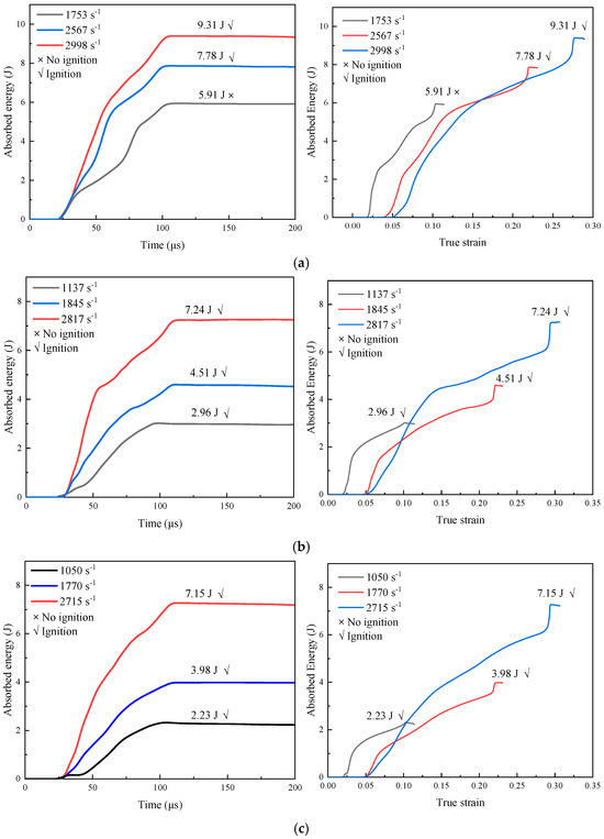 Figure 14 shows the curve of absorbed energy of the 0°, 30°, and 45° WMoZrNiFe energetic structural materials. As shown in Figure 14, from the perspective of absorbed energy -time characteristics, before 20 µs of loading, the energy absorption of the three samples remains nearly 0 J, indicating that the samples are in the elastic deformation stage with little energy absorption. Between 20 µs and 110 µs of loading time, the samples enter the plastic deformation stage, and energy absorption starts to increase as the samples undergo damage and fracture. At around 110 µs, the samples are essentially completely fractured, and the energy absorption stabilizes. For the 0° WMoZrNiFe energetic structural material, when the strain rate reaches 2567 s−1, the energy absorption reaches 7.78 J, and ignition occurs under the threshold condition. For the 30° and 45° WMoZrNiFe energetic structural materials, ignition occurs with only 2.96 J and 2.23 J of absorbed energy. From the perspective of absorbed energy-strain characteristics, the specimen undergoes deformation through energy absorption. As strain increases, the material progressively enhances its energy absorption capacity until fracture occurs. This indicates that the inclination angle of the specimen has a significant impact on the minimum absorption energy required for ignition. As the inclination angle increases, the minimum absorption energy required for ignition decreases. It is because as the inclination angle increases, the specimen is obviously in compression-shear stress, which easily induces the dynamic fracture. It means that the compression-shear stress strengthens plastic flow in localized regions, and furthermore mechanical energy is converted into thermal energy through plastic deformation. Finally, the ignition occurs.