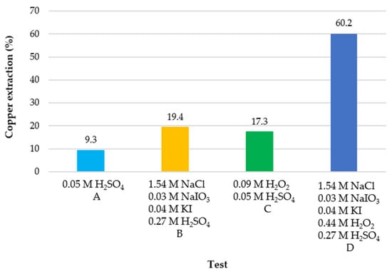 The potential for chalcopyrite leaching can be adjusted by the presence of H2O2. For example, according to Taboada et al. [57], this oxidant caused a greater effect on the redox potential of the leachate solution, increasing the potential from 530 mV to 600 mV v/s SHE. However, low concentrations of hydrogen peroxide obtain low concentrations of copper in the leachate solution. This was also reported by Velásquez-Yévenes [58], whose study revealed that copper extraction was increased in the redox potential range of 550 to 620 mV.