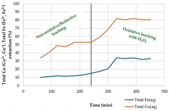 The results obtained by Petrović et al. [46] demonstrate that copper extraction undergoes a substantial increase within the initial 60 min of the reaction. However, as a consequence of the catalytic decomposition of hydrogen peroxide, the dissolution of chalcopyrite ceased thereafter.