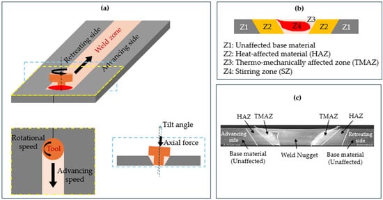 Overview of FSW process: (a) schematic of the FSW process (Addapted from [13] under the terms and conditions of the Creative Commons Attribution (CC BY) license); (b) typical microstructural regions (adapted and reused from [13] under the terms and conditions of the Creative Commons Attribution (CC BY) license); and (c) cross-sectional view of the weld nugget and surrounding zones (Reprinted with permission from [14]. 2018, Elsevier).