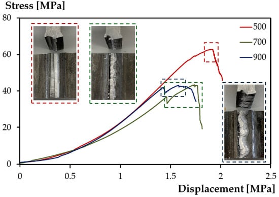 In [24], the study examines how varying the rotational speed during FSW affects the mechanical properties of T-joints, specifically at speeds of 500, 700, and 900 rpm. From Figure 4, the curve joints made at 500 rpm show higher stress values compared to those made at 700 or 900 rpm. A lower speed resulted in fewer defects. These defects acted as stress concentrators at higher speeds, reducing the strength of the resulting welded joint.