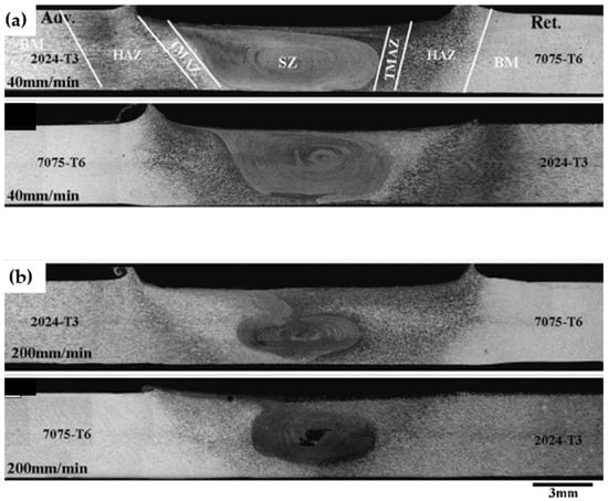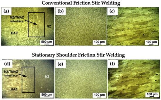 These microstructural changes, driven by thermal input, material flow, and tool geometry, ultimately govern the mechanical behavior of welded joints. The following section examines the impact of FSW on key mechanical properties such as strength, ductility, hardness, and fatigue resistance [62]. This can lead to different microstructures in the nugget zone, which can impact the strength and corrosion of the weld, as can be seen in Figure 3.