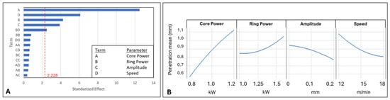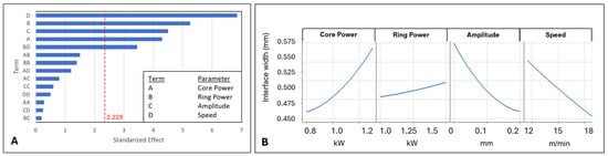 The results obtained from the 25 joints were analyzed to evaluate the effect of the four process variables (as described in Table 4) on two responses: interface width and penetration. Figure 2 shows the standardized Pareto chart and the welding parameters’ response for interface width. As observed, all welding parameters, in addition to the ring power–speed combination, displayed a relevant impact on the response with a significance level of α = 0.05. This significance was determined by comparing the standardized effects against the critical t-value of 2.228, which corresponds to 10 degrees of freedom and defines the threshold for statistical significance in the Pareto chart. Any term with a standardized effect exceeding ±2.228 is considered significant at the 95% confidence level.