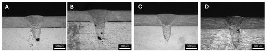 The joints were evaluated using optical microscopy. Macrographic analysis of both the top view and cross sections revealed key features such as penetration, weld width, and the presence of defects. Porosity was the most common defect, characterized by rounded cavities scattered throughout the weld and along the edges of the interface. In addition, irregular wormhole porosities were also found at the root of the weld. This defect is usually associated with the collapse of the molten pool over the keyhole.