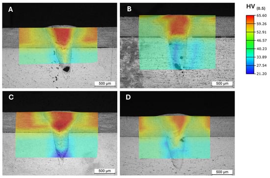 Microhardness profiles of the Al-Al joints: 6 (A), 10 (B), 16 (C), and 25 (D).