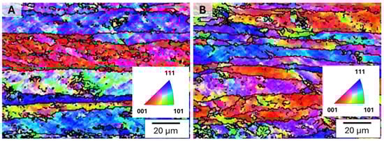 IPF maps of the as-received AA1050 with 0.5 mm (A) and 1.5 mm (B).