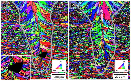The IPF maps of joints 6 and 16 can be seen in Figure 7, where the grains were traced with a disorientation of 15 °. In the weld zone, elongated grains were observed, aligned with the center of the weld, while equiaxed grains were predominant at the center. Additionally, small equiaxed grains were evident in the HAZ. These grain characteristics were shaped by the solidification process, with the grains growing in the direction of the heat flow, which was perpendicular to the molten pool. As a result, the columnar grains grow towards the weld centerline. On the other hand, the grains displayed a random orientation, with no orientation patterns observed near the detected pores.
