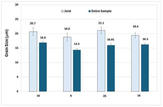 For the measurement of grain size, the data were partitioned to include only the grains that were part of the weld, and the results are shown in Figure 8. No significant differences were noted among the values measured in all samples, which ranged from 18.8 to 21.2 µm, with an average of 20 µm. This indicates that no trends have been observed with respect to process speed or the use of wobbling. Additionally, an increase in grain size up to 32% was observed in the welded joint area compared to the rest of the sample, which corresponds to the high heat input and rapid thermal cycles associated with the process.