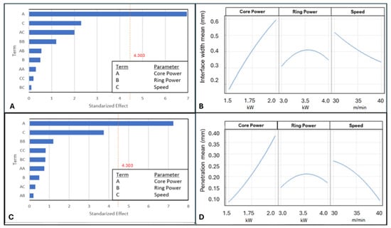 Standardized Pareto chart (A) and parameters response for interface width (B). Standardized Pareto chart (C) and parameters response for penetration (D) of Al-Cu joints.