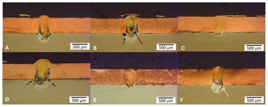 Macrographs of the selected specimens of the Al-Cu joints: 2 (A), 4 (B), 5 (C), 6 (D), 11 (E), and 13 (F). Black arrows indicate the pores and white arrow cracks.
