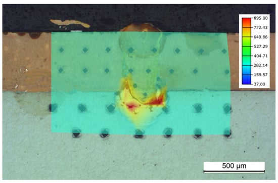Figure 12 displays the microhardness map of joint 02. The average hardness of the base material was 85 HV for copper and 43 HV for aluminum. A significant improvement in the hardness was observed in the welding zone, where the peak measured in the interface reached values approximately 900 HV. In contrast, no notable differences in hardness were observed in the rest of the weld or HAZ.