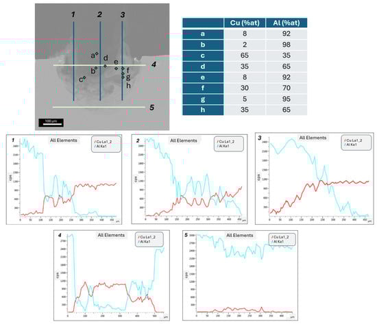 This arrangement has been previously reported in another study [21], where four distinct layers of phases were unequivocally identified. The Cu9Al4 phase is situated close to the copper, while the CuAl2 phase is adjacent to it. In that work, these layers were clearly identified and well-defined, in contrast to the results presented in this investigation, where the layers were not uniform and were less delineated. This difference could be attributed to the processing speed, as the results presented in this study were conducted at a speed three times higher than in the previous study, which may lead to the non-homogeneous nature of the intermetallic compound region.