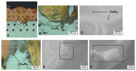 A columnar phase was observed adjacent to the copper as well as on an isolated small island in the weld. This phase appeared as a darker region in the optic image (Figure 14D) and as a brighter area in SEM images (Figure 14E,F). Additionally, it exhibited a high hardness of approximately 900 HV and a copper composition exceeding 75% in wt., indicating that it could correspond to the Cu9Al4 phase based on both hardness and composition (Figure 13; location c) analysis. Next to this zone, closer to the lower part of the weld, a grayish zone was observed (Figure 14D), with a composition of 50% wt. of copper (Figure 13; location d and h) and hardnesses around 530 HV, which can be identified with the phase CuAl2.