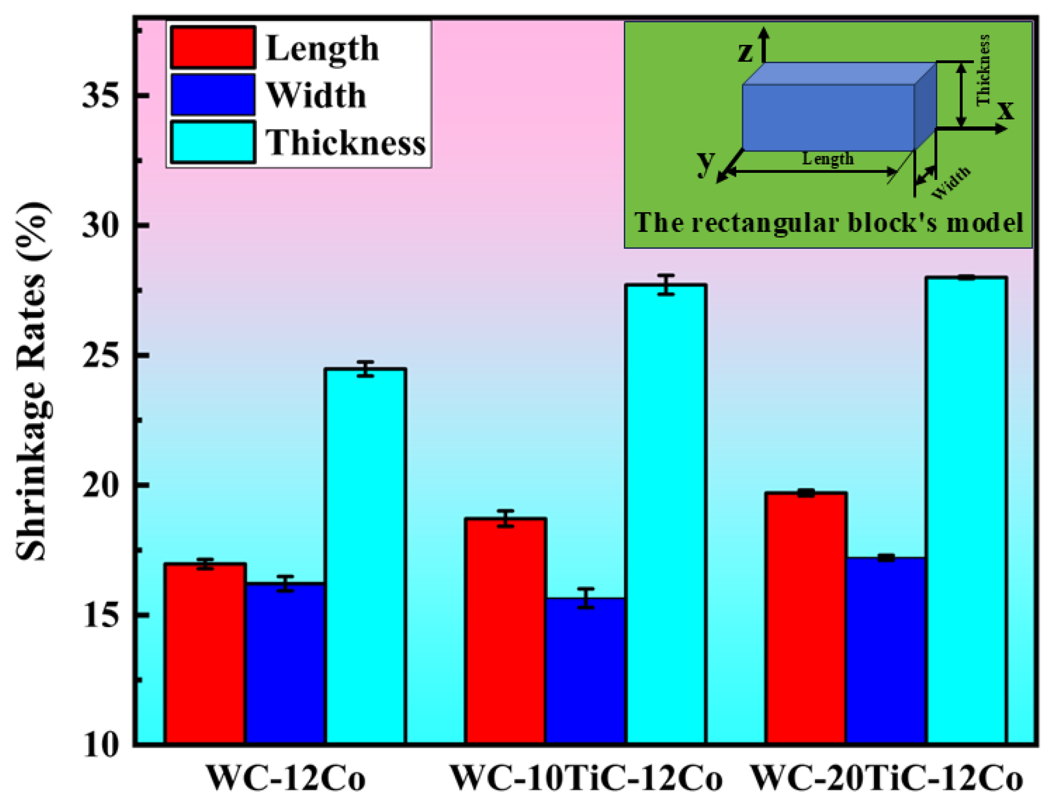 - Petersson, A. Sintering Shrinkage of WC–Co and WC–(Ti, W)C–Co Materials with Different Carbon Contents. Int. J. Refract. Met. Hard Mater. 2004, 22, 211–217. [Google Scholar] [CrossRef]