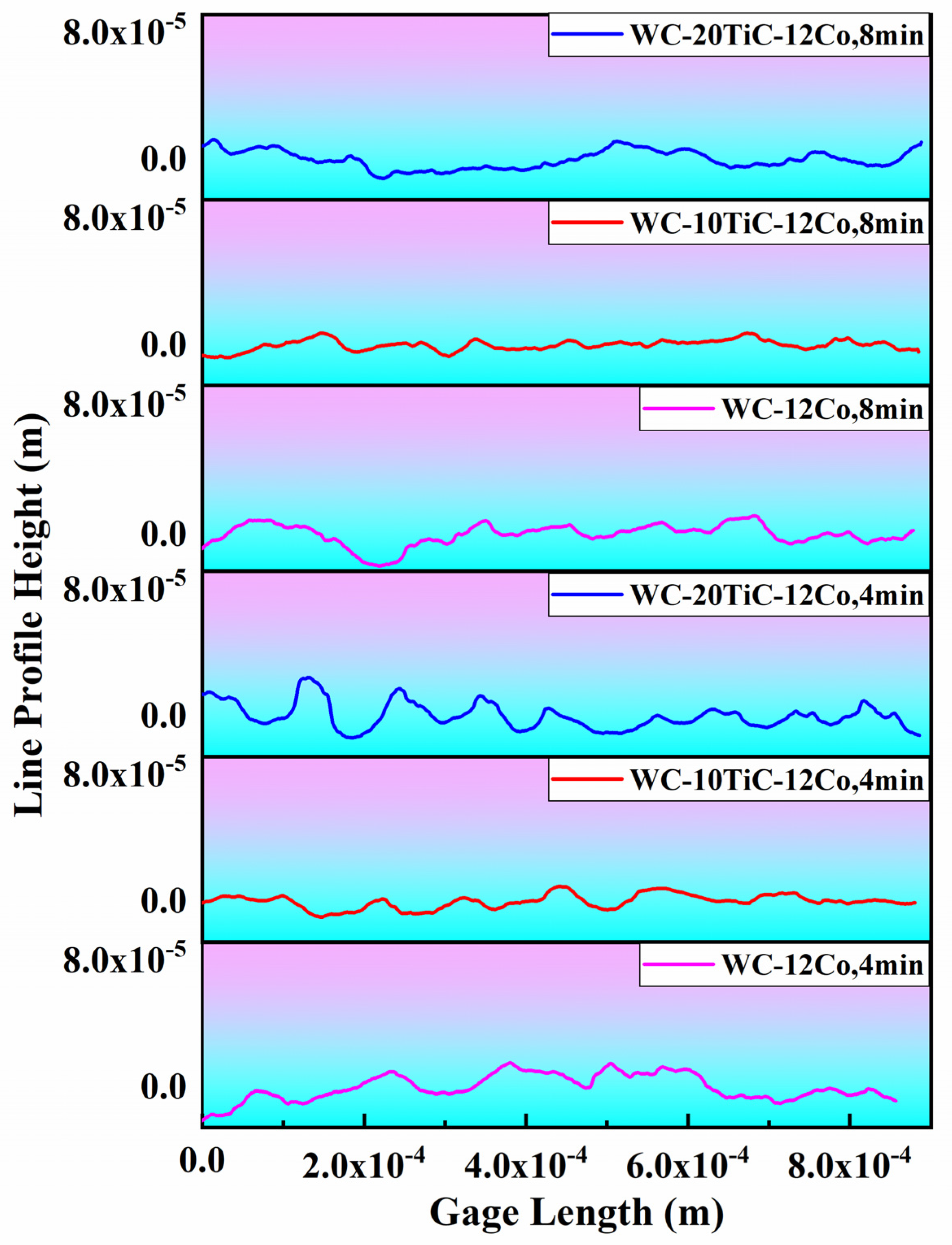 - The addition of TiC refines the WC grain size. The average WC grain size for WC-12Co carbides with 10 wt.% and 20 wt.% TiC are 0.88 μm and 0.87 μm, respectively, compared to 0.98 μm for TiC-free WC-12Co.