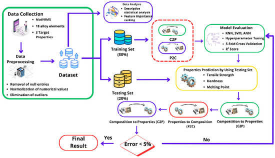 A bidirectional machine learning framework for predicting and designing superalloys based on composition and properties (as shown in Figure 1)—Composition-to-Properties (C2P) and Properties-to-Composition (P2C)—is the focus of this paper. The C2P model is used to predict mechanical and physical properties (tensile strength, hardness, melting point) from already known alloy compositions and serves not only as a predictive tool, but also as a basis for meaningfully understanding the correlation of each compositional element to the target properties. On the other hand, the P2C model serves as an inverse design model, where it predicts the combination of chemical compositions based on desired properties. This approach is essential for practical alloy development, where engineers start with performance requirements and look for compositions that satisfy them.