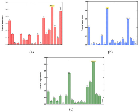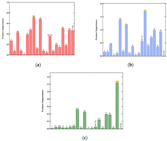 Feature importance of iron–nickel Superalloy: (a) Tensile strength; (b) Hardness; (c) Tensile Melting Point. The highlights show the most important feature.