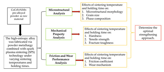High-entropy alloys are usually prepared by melting. However, cast high-entropy alloys suffer from compositional segregation, porosity, and other casting defects [11,12]. In contrast, powder metallurgy can prepare bulk high-entropy alloys with nano-sized grains and a uniform organization and composition, which can significantly improve the mechanical properties of high-entropy alloys. Powder metallurgy can also enable near-final forming of metal parts and improve material utilization. In addition, powder metallurgy can easily lead to the addition of second-phase particles, creating metal matrix composites.